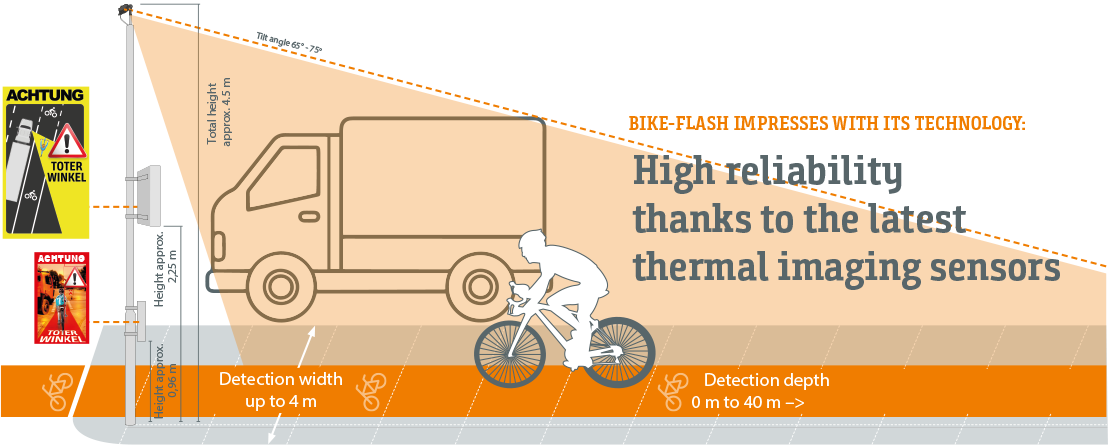The bike-flash is permanently installed as a warning device at intersections and uses a state-of-the-art thermal sensor camera to permanently monitor a detection zone that can be set up to four meters wide and up to 40 meters deep as required in order to warn motorists of a collision with a cyclist. In particular, the dangerous right/left turn situations in which drivers overlook cyclists or pedestrians in the blind spot can be prevented. As with the well-known and proven speed displays, we also rely on the effective visual effect of immediately raising the awareness of road users.